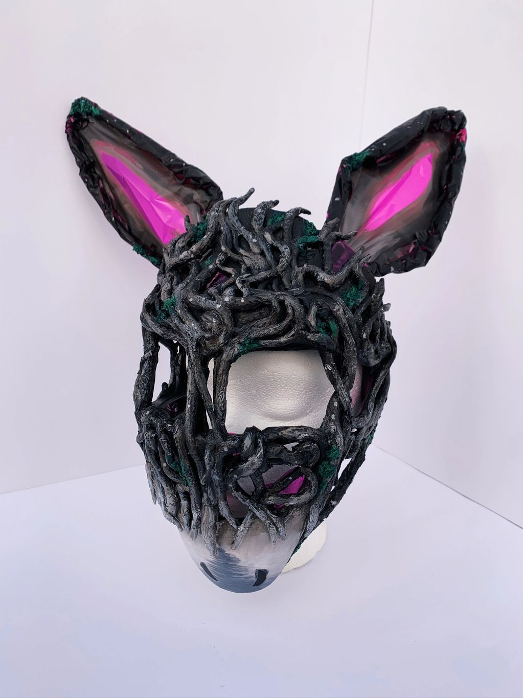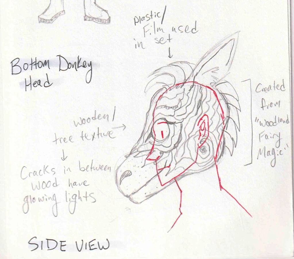 First sketch of Bottom's donkey mask. Ultimately, the director wanted the mask to look like it was created by the same magic the fairies possess, so it would have a lot of wooden/tree texture. In between the gaps in the vines, I added cellophane in the color that matched Puck's costume, as to tie the two characters together since Puck is the one who curses Bottom with the donkey head.