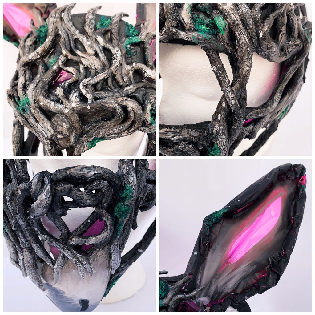 Process of building onto the frame with with EVA foam and foam clay to create the vine shape, with silicone caulk to create wood texture.